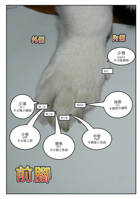少商Lu 11:在前腳內側狼爪旁。用在急性的創傷,例如脫臼。可強化免疫系統。
