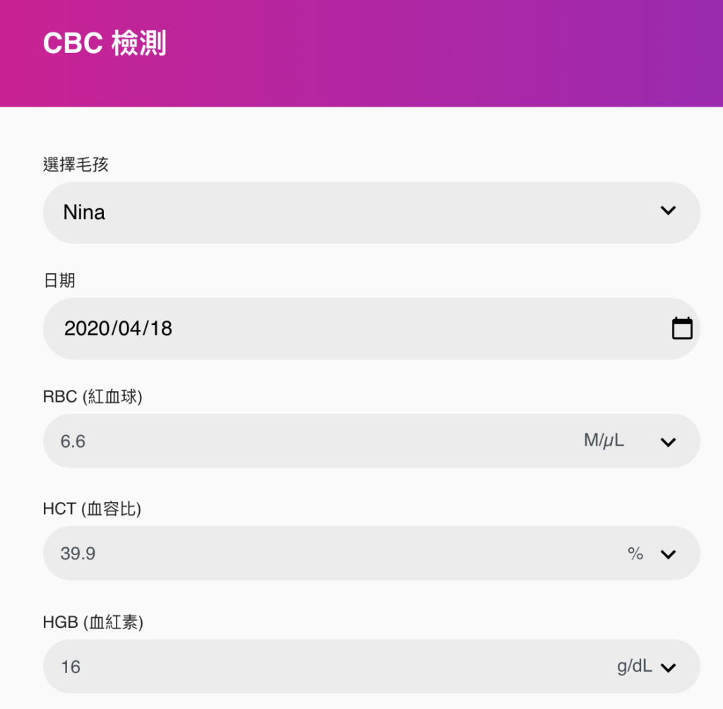 再來即是各項資料輸入,當有帶毛孩去健檢或醫療時,即可詳實的將各項資料一一輸入各個欄位,這樣日後即可以調閱比對各項數值是否有異常,也有助於醫生診斷。