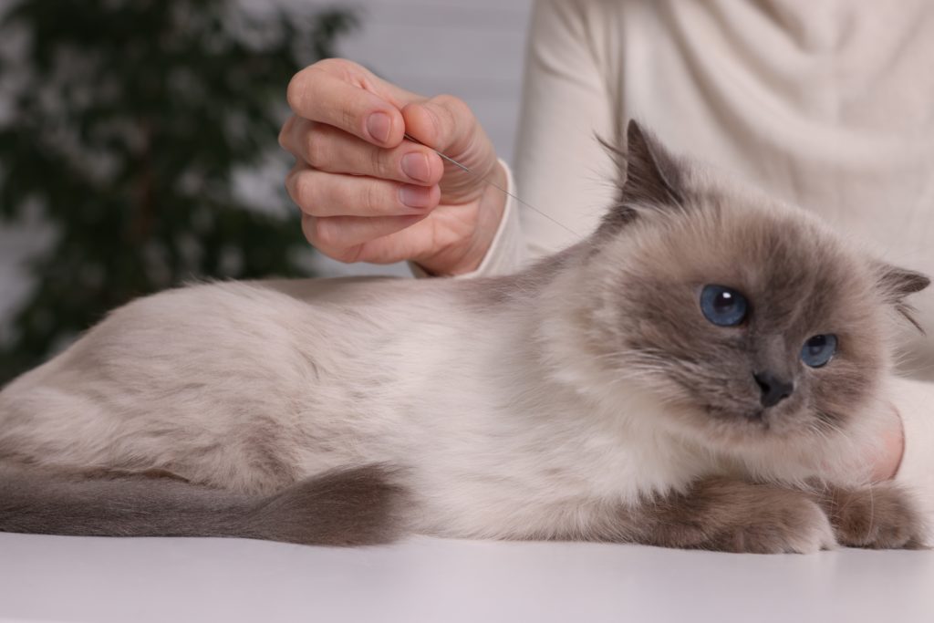 對貓來說,雷射針炙是一種安全且愉快的疼痛緩解方法,也被納入疼痛管理計畫中被廣泛應用。目前已知被應用在貓的背痛、骨關節炎、膝關節疼痛、術後疼痛、持續性除爪疼痛、過度梳理毛髮(與背痛相關)、間質性膀胱炎和其他病症,在獸醫學中的應用的證據正在不斷增加。
